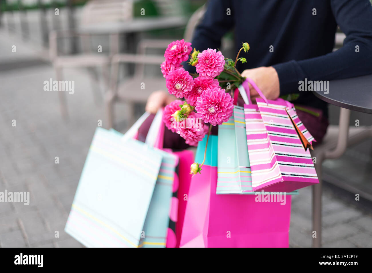 Romantic Man Giving Flowers Bouquet And Bunch Of Pink Gift Bags Near Cafe Ready For Birthday Party Or Romantic Date Copy Space Mother S Women S W Stock Photo Alamy